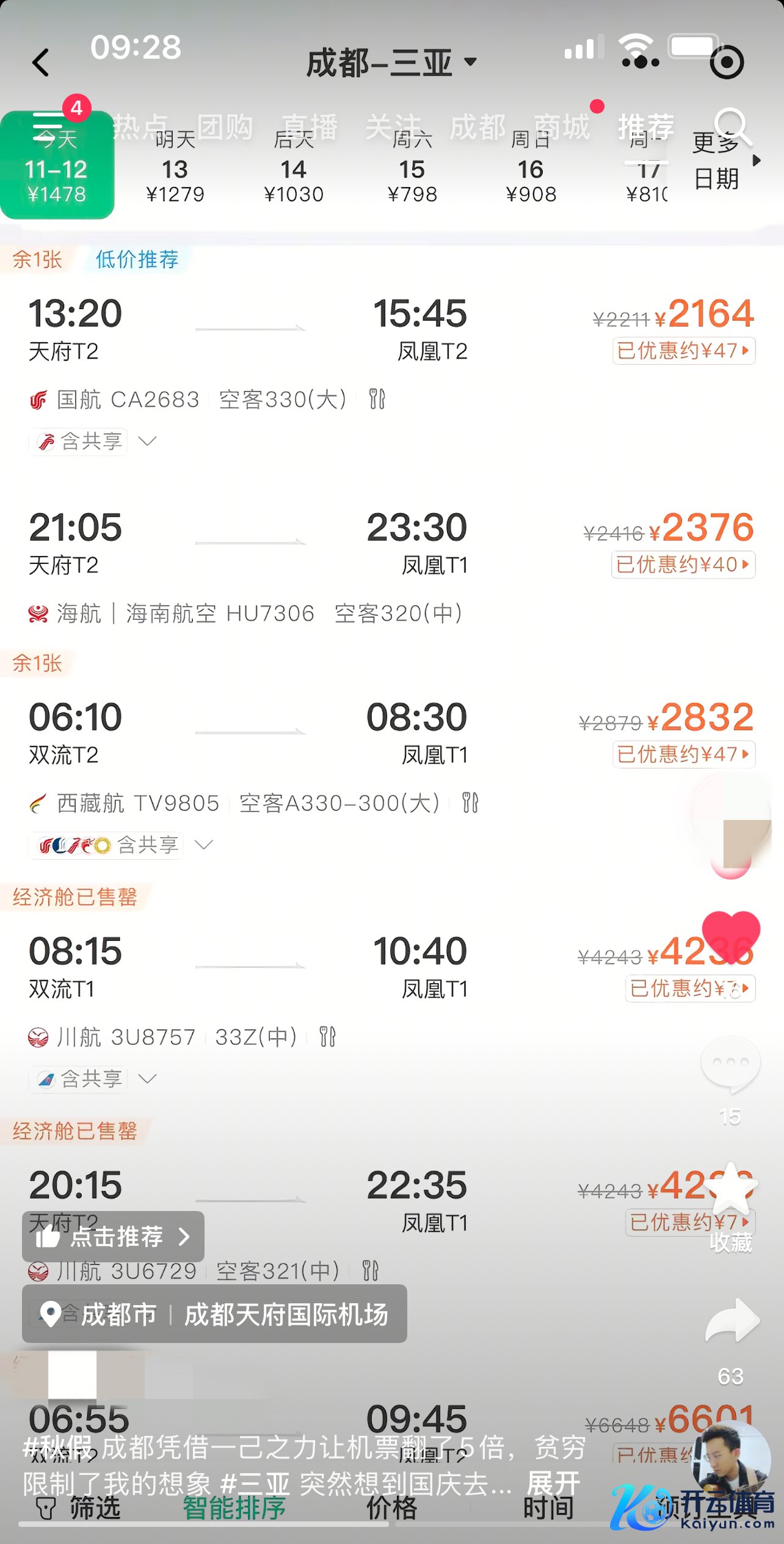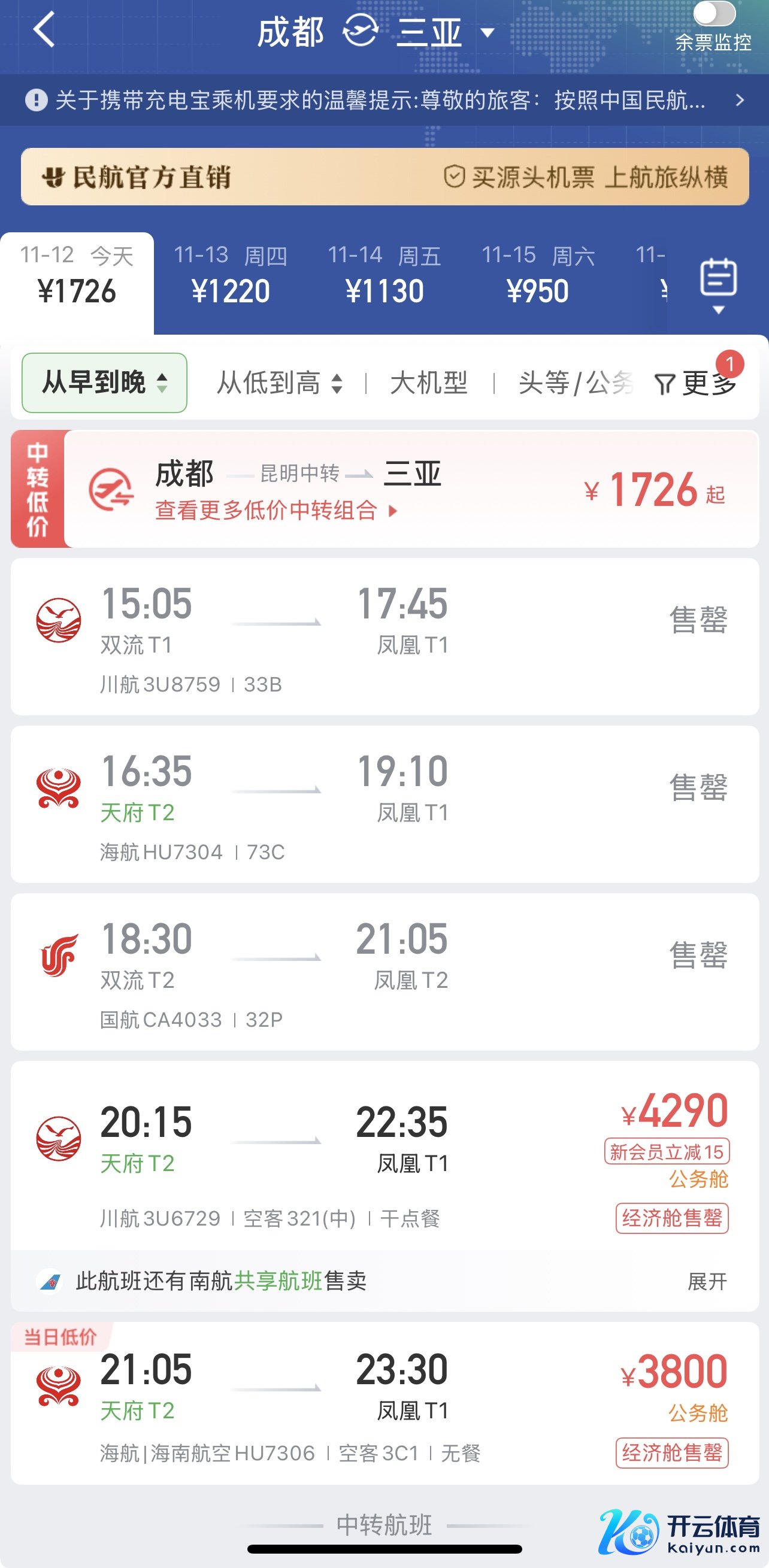 封面新闻记者陈静 “成王人凭一己之力让机票翻了5倍,空泛松手了我的思象。”11月11日晚,正准备为孩子诡计秋假旅行的成王人家长刘女士,在掀开购票软件后发出了这么的感触。她原来缱绻带孩子前去三亚,却发现11月12日成王人飞往三亚的机票价钱高得惊东谈主。 记者查询成王人飞三亚航班大多已售罄 成王人飞三亚机票最高潮至6000元 家长:价钱比暑假还高 “绝大大王人航班机票售罄,偶尔一两个航班融会只剩一两张票,最高价钱尽然涨到了6000多元。”刘女士示意,这让她无法收受,“之前国庆节去三亚机票才一千多元