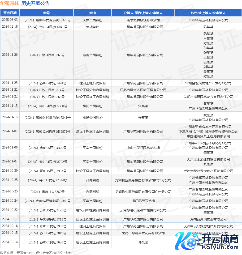 案号:(2024)豫14民终5263号审理法院:河南省商丘市中级东说念主民法院案由:劳务协议纠纷当事东说念主信息: 原告/上诉东说念主:广州华苑园林股份有限公司 被告/被上诉东说念主:陈某某、王某某、陈某某、孙某某、张某某、王某某、姜某某、刘某某、姜某某、陈某某开庭日历:2024年11月26日笔据统计,近一年内以广州华苑园林股份有限公司为当事东说念主的历史开庭公告有111则,其中案由为“缔造工程施工协议纠纷”的公告以41则居首,其次为“商业协议纠纷”有22则,“劳务协议纠纷”有17则。历史开庭公告(前20条)如下: