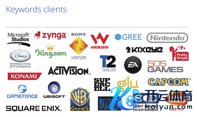 在TGA大会上(黧黑)经常露脸的背后,熠文实践上也曾在「为25个顶级游戏企业中的24个和系数10个顶级迁徙游戏企业提供行状」。官网知道,以下大厂和巨头们都是它的客户。