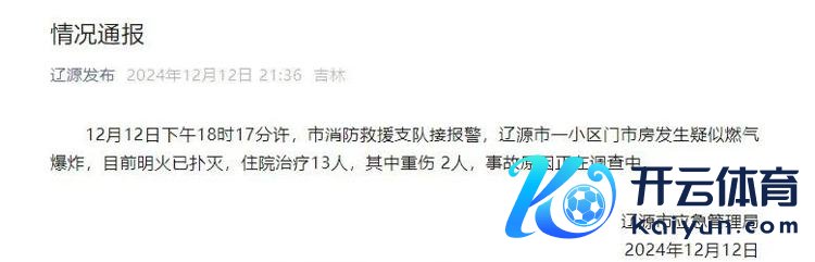 12日晚,辽源市救急贬责局发布情况通报称,疑似燃气爆炸导致事故,现在入院治愈13东说念主,其中重伤2东说念主。
