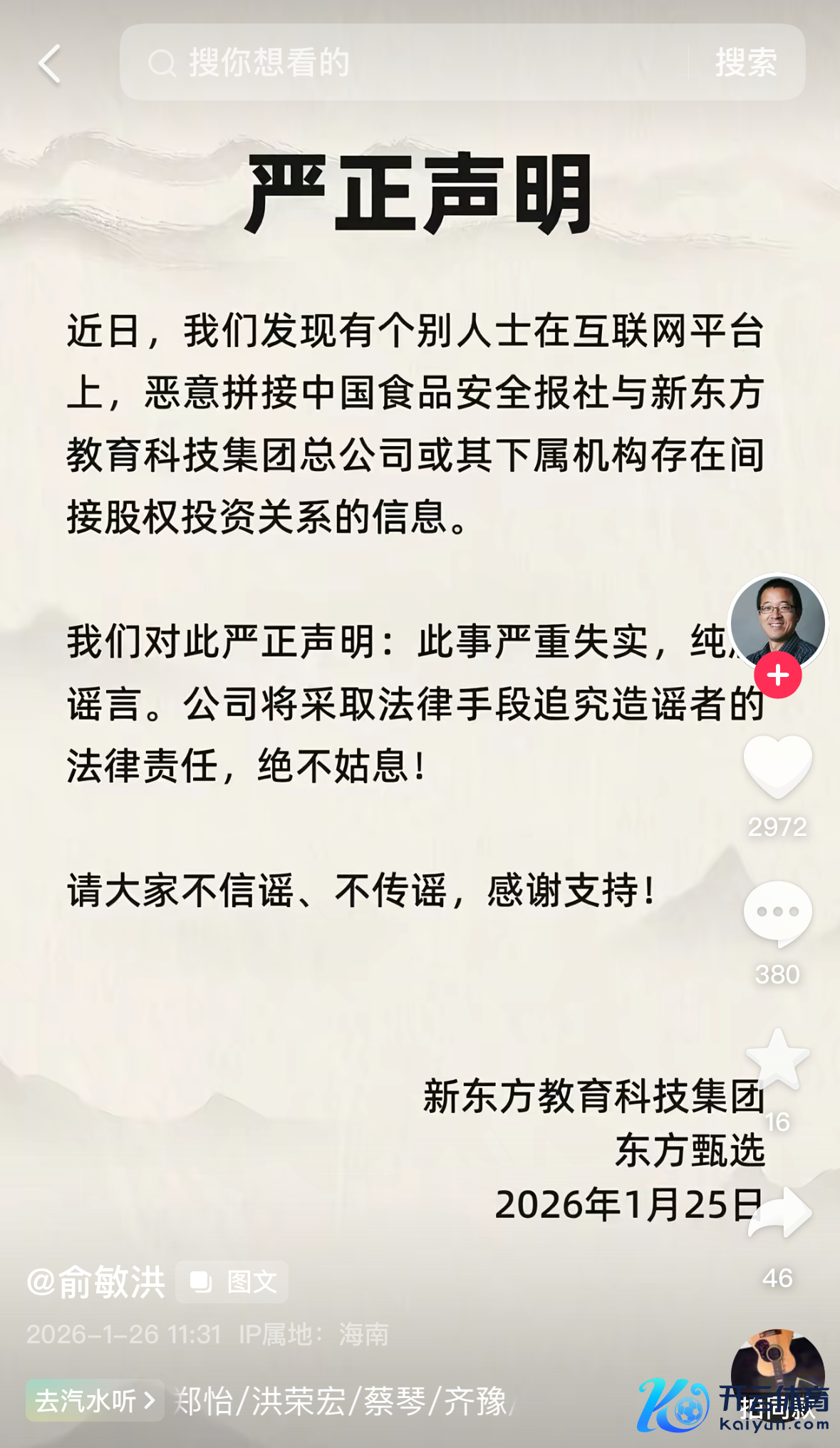 俞敏洪辟谣中国食物安全报社与新东方存在曲折股权投资关系:严重装假体育游戏app平台俞敏洪辟谣中国食物安全报社与新东方存在曲折股权投资关系:严重装假