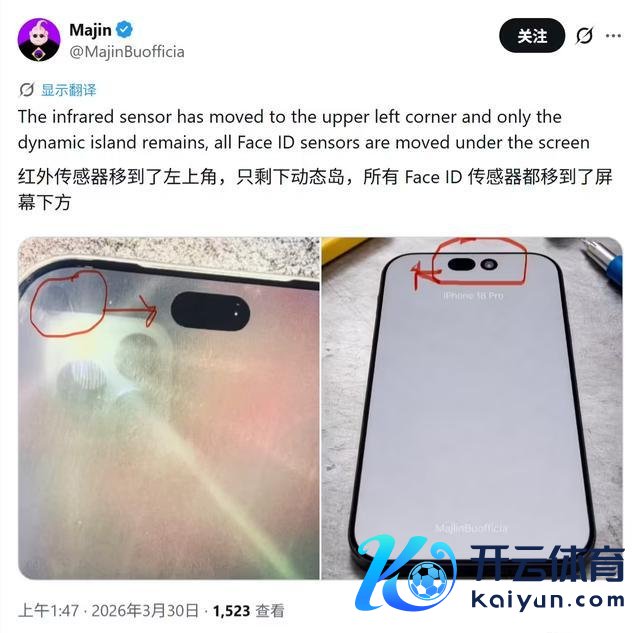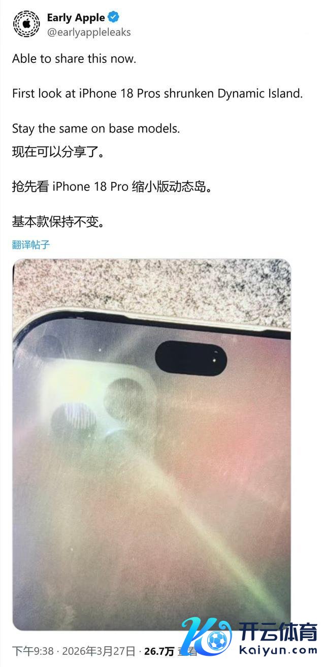 3月31日开yun体育网,据IT之家音讯,多名音讯东说念主士曝光疑似 iPhone 18 Pro的屏幕谍照,苹果大幅削弱灵动岛挖孔面积,从而减少视觉滋扰、普及屏占比。 据先容有账号“Early Apple Leaks”最初发布琢磨像片,声称 iPhone 18全系标配这种新式小尺寸挖孔绸缪。 针对这张谍照,另一位爆料东说念主 Majin Bu 给出详备技巧分析。他指出,苹果将红别传感器好意思妙移至屏幕左上角的融会屏下方。(IT之家)