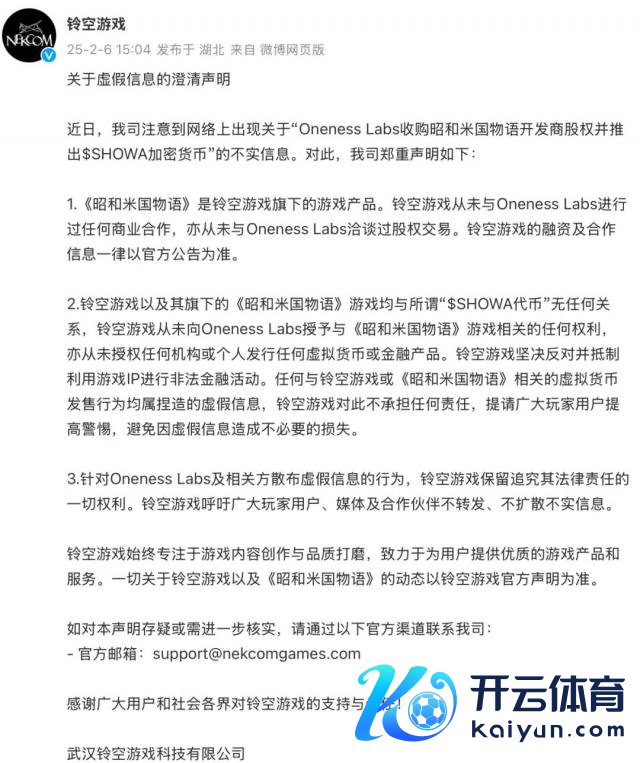 文 | 刘士武 2 月 6 日,国产游戏《昭和米国物语》的开拓商铃空游戏发布官方声明,针对近期网罗崇高传的" Oneness Labs 收购铃空游戏股权并推出 $SHOWA 加密货币"的讯息进行了辟谣。 铃空游戏暗示,公司从未与 Oneness Labs 进行过任何交易延续,也未授权任何机构或个东谈主刊行与《昭和米国物语》联系的诬捏货币或金融家具。 铃空游戏官方声明(开头:微博) 此前,Oneness Labs 文书收购铃空游戏股权,并推出基于《昭和米国物语》IP 的加密货币 $SH
