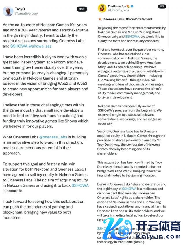 猖狂发稿,Oneness Labs 和铃空游戏辘集首创东谈主 Troy Dunniway 折柳在国外酬酢媒体发表了对于此事的声明(下图)。36 氪游戏就此向铃空游戏打算,对方暗示公司此前的官方声明对这些讯息雷同灵验,联系动态正在进一步治理中。