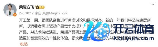 2月8日,在开工首日,荣耀居品线总裁方飞在酬酢平台发文,和团队进行了密集的务虚探求和指标对王人,夸耀了诸多信息。方飞暗意,新的一年咱们将坚捏底层立异,以耗尽者需求驱动居品竞争力进步,探索全新址品体验,打造个性赫然的Flag居品。AI时期捏续演进,荣耀居品研发团队也将一如既往冲在AI前沿范畴,引颈打造愈加聪慧高效的个性化体验。很快咱们就将有全新的AI居品和工作带给民众。