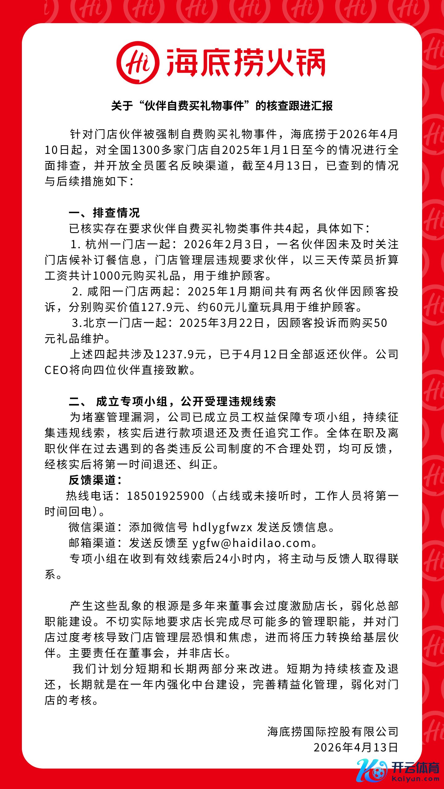 海底捞回复“强制职工私费买礼物”:已核实雷共事件4起 公司CEO将向四位伙伴径直致歉海底捞回复“强制职工私费买礼物”:已核实雷共事件4起 公司CEO将向四位伙伴径直致歉