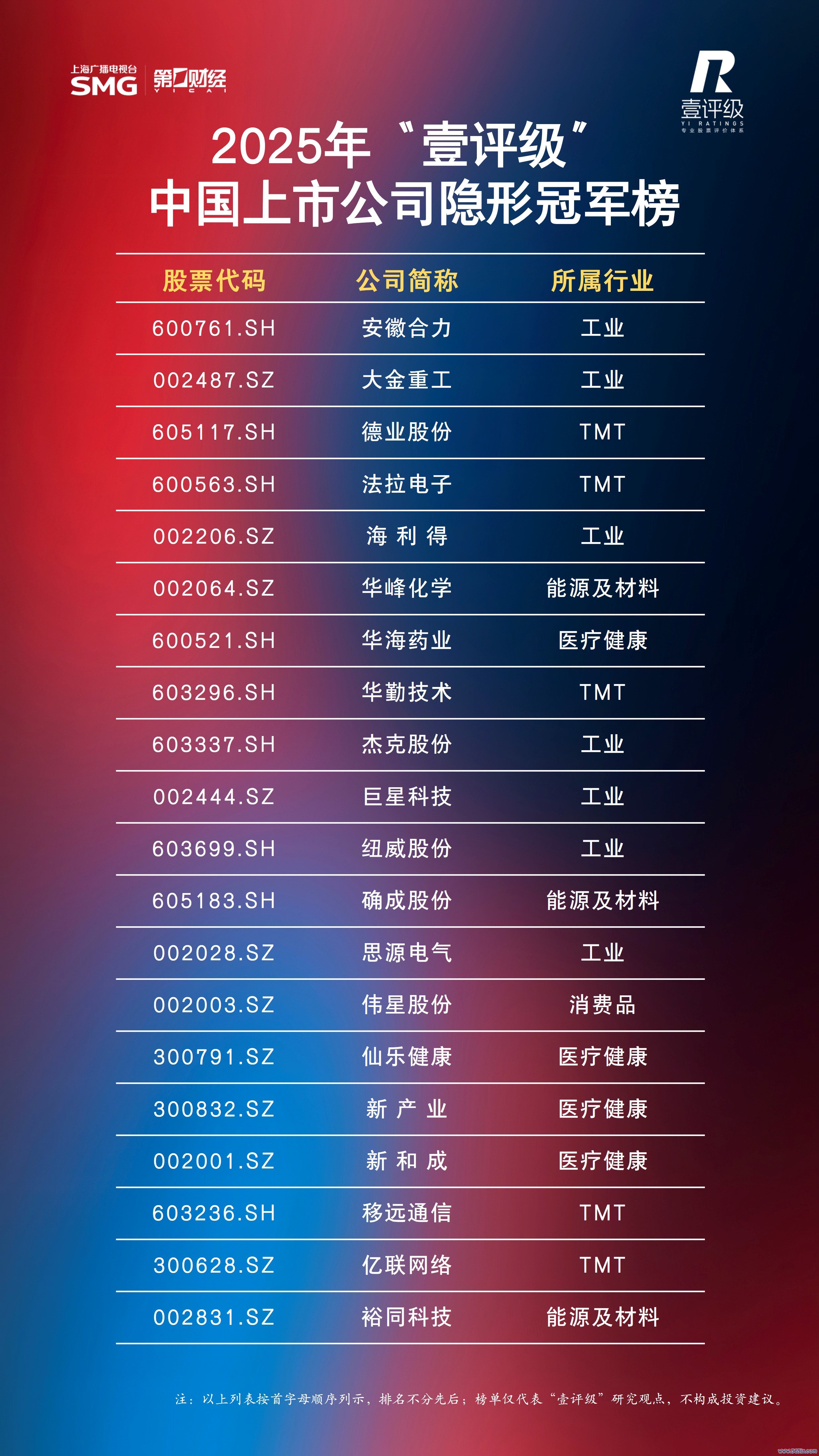 2025年“壹评级”中国上市公司隐形冠军榜重磅发布