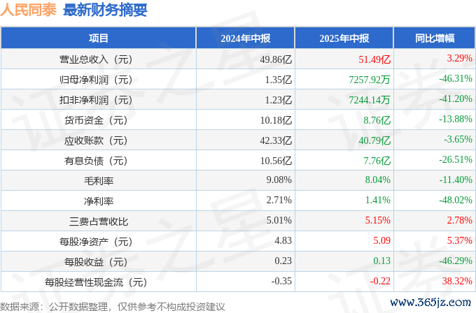 据本站公开数据整理,近期东谈主民同泰(600829)发布2025年中报。字据财报领路,东谈主民同泰增收不增利。规摹本叙述期末,公司营业总收入51.49亿元体育游戏app平台,同比高潮3.29%,归母净利润7257.92万元,同比着落46.31%。按单季度数据看,第二季度营业总收入24.83亿元,同比高潮3.98%,第二季度归母净利润2673.83万元,同比着落52.97%。