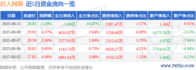 本站讯息,完结2025年8月11日收盘开yun体育网,巨东谈主网罗(002558)报收于28.83元,下落3.29%,换手率2.71%,成交量52.36万手,成交额15.25亿元。