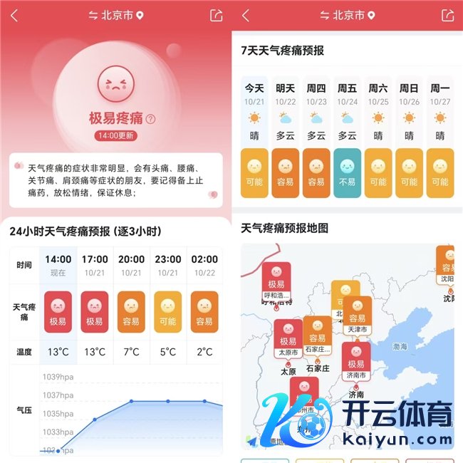 重要痛苦是降温期另一常见健康困扰。气温骤降、气压变化会影响重要周围组织的血液通顺与代谢,诱发或加剧风湿性重要炎、骨重要炎患者的重要痛苦。墨迹天气的“天气痛苦”功能,通过整合气温、气压、湿度等数据,提前预判重要不适风险,冲破“痛苦发作才轻率”的被迫神色:以“极易”、“容易”、“可能”等分级呈现24小时及7天重要痛苦风险,并给出“备上麻醉剂”等教导,同期还通过天气痛苦预告舆图展现世界不同区域天气痛苦预告情况,为短途或长图出行用户提供参考。